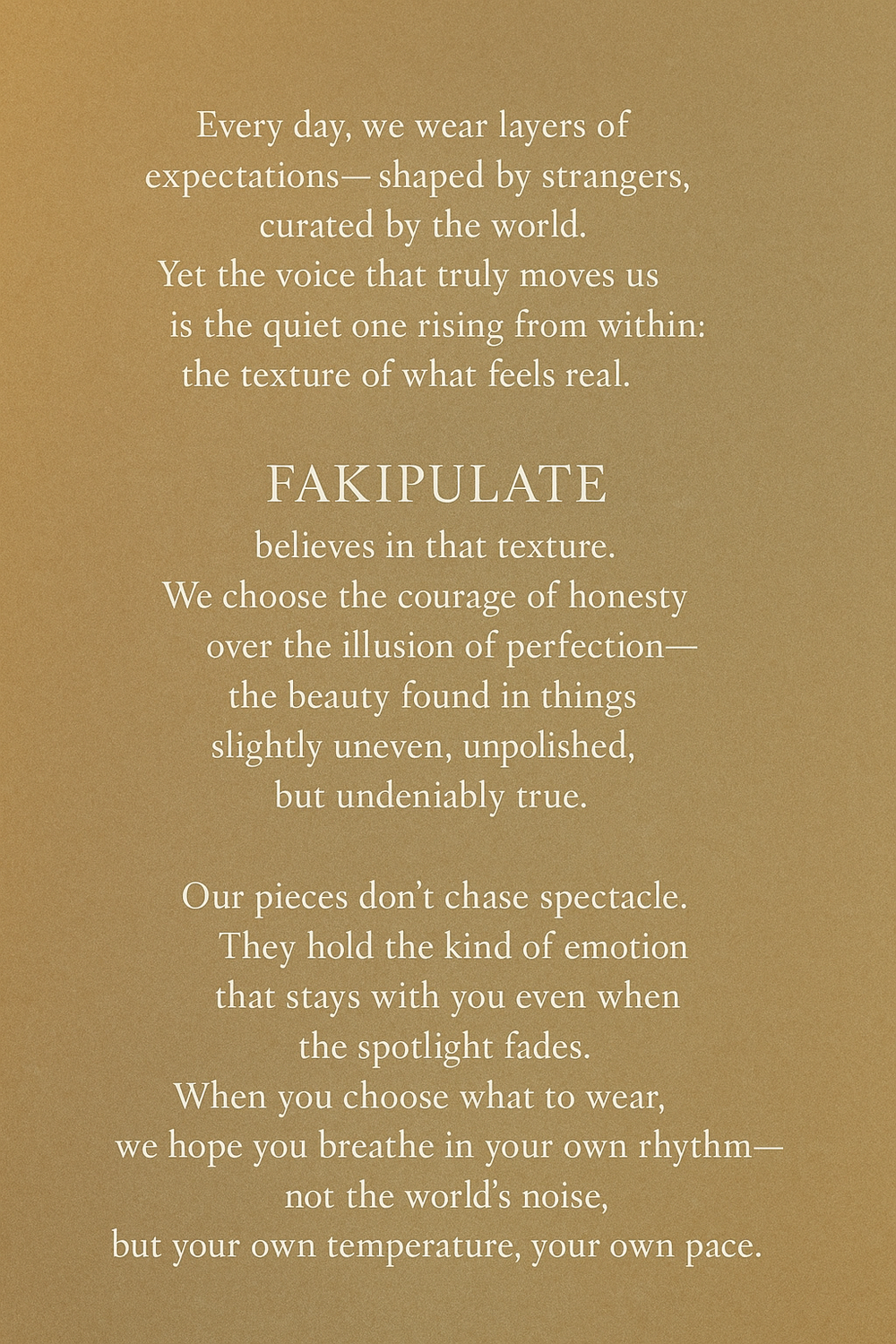 우리는 매일 누군가의 시선을 입고 살아갑니다. 하지만 진짜 나를 움직이게 하는 건 남이 정해준 기준이 아니라, 내 안에서 천천히 피어오르는 ‘진짜의 결’입니다. FAKIPULATE는 그 결을 믿습니다. 완벽하게 다듬어진 이미지보다, 살짝 흔들리고, 조금은 삐뚤어져도 스스로를 숨기지 않는 용기. 우리가 만드는 옷은 화려함을 흉내 내지 않습니다. 빛나는 순간보다, 빛을 잃어도 묵묵히 나를 지켜내는 마음을 담습니다. 당신이 옷을 고르는 순간, 세상의 기준이 아니라 당신만의 속도와 온도로 숨을 쉬기를. FAKIPULATE는 그 조용한 진심을 위해 존재합니다.